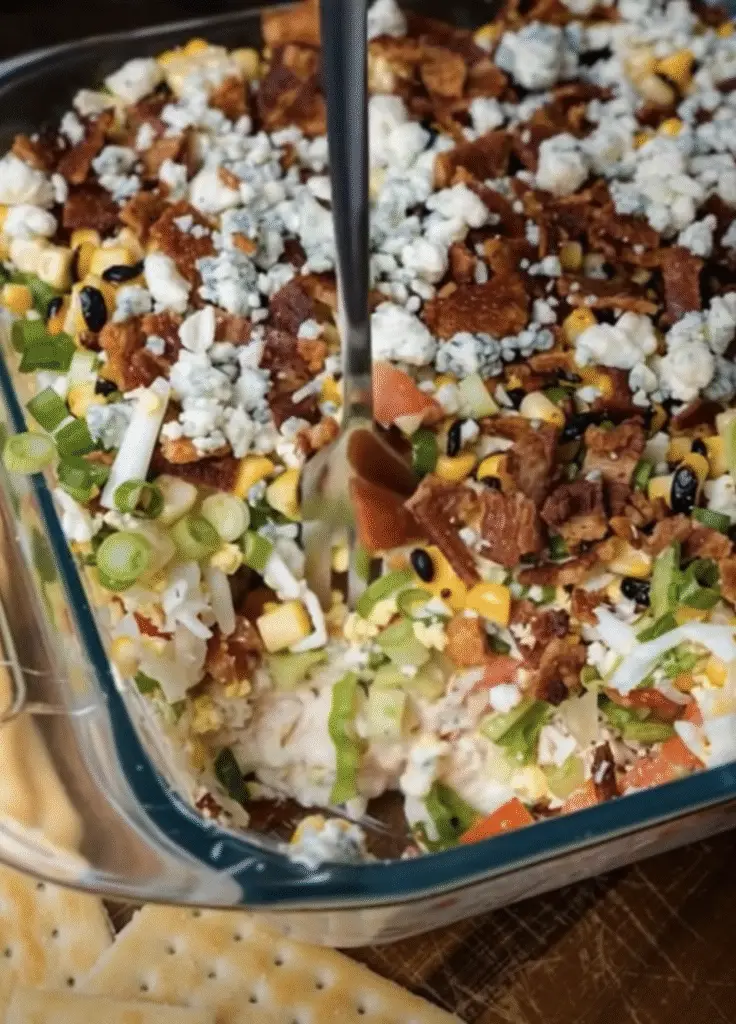 Every layer plays a role. The lettuce brings freshness, tomatoes add brightness, and green onions provide sharpness. Because the corn brings sweetness and grilled flavor, it enhances the savory notes. Bleu cheese finishes the dish with richness and a gentle tang. These layers blend beautifully in each scoop, offering the perfect balance of creamy, crunchy, savory, and fresh.
