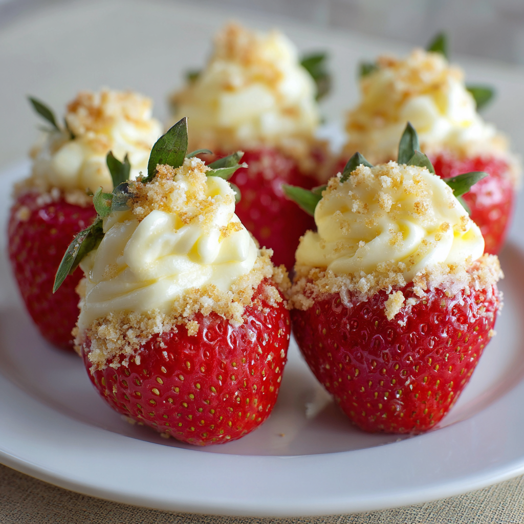 Think deviled eggs… but make it dessert. These are fresh strawberry halves piped with fluffy cheesecake filling and topped with graham cracker crumbs or strawberry crunch. They’re bite-sized, eye-catching, and anything but boring!!