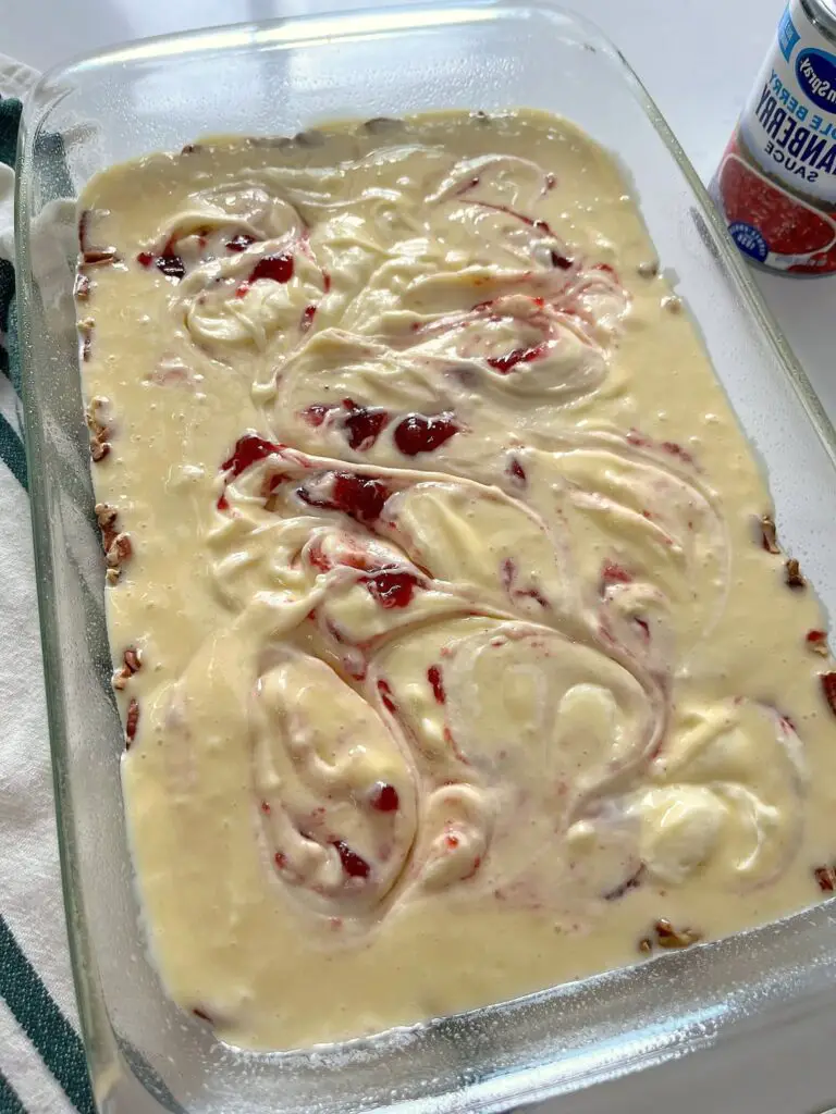 These bars are everything you love about a classic cheesecake — creamy, rich, tangy — layered over a buttery crust, then swirled with ribbons of tart cranberry sauce. They bake up in a simple 9×13 pan and slice like a dream.