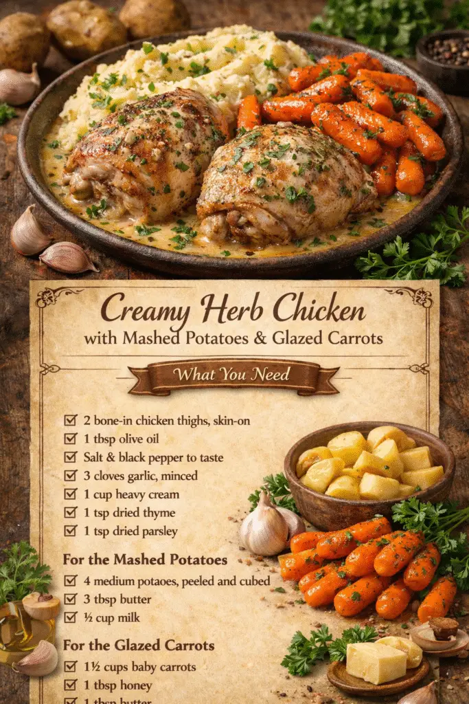 Because this Creamy Herb Chicken with Mashed Potatoes & Glazed Carrots recipe uses everyday ingredients and easy cooking techniques, even beginner cooks can create a restaurant-quality meal that feels warm, hearty, and deeply satisfying.