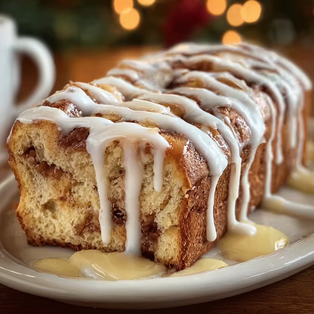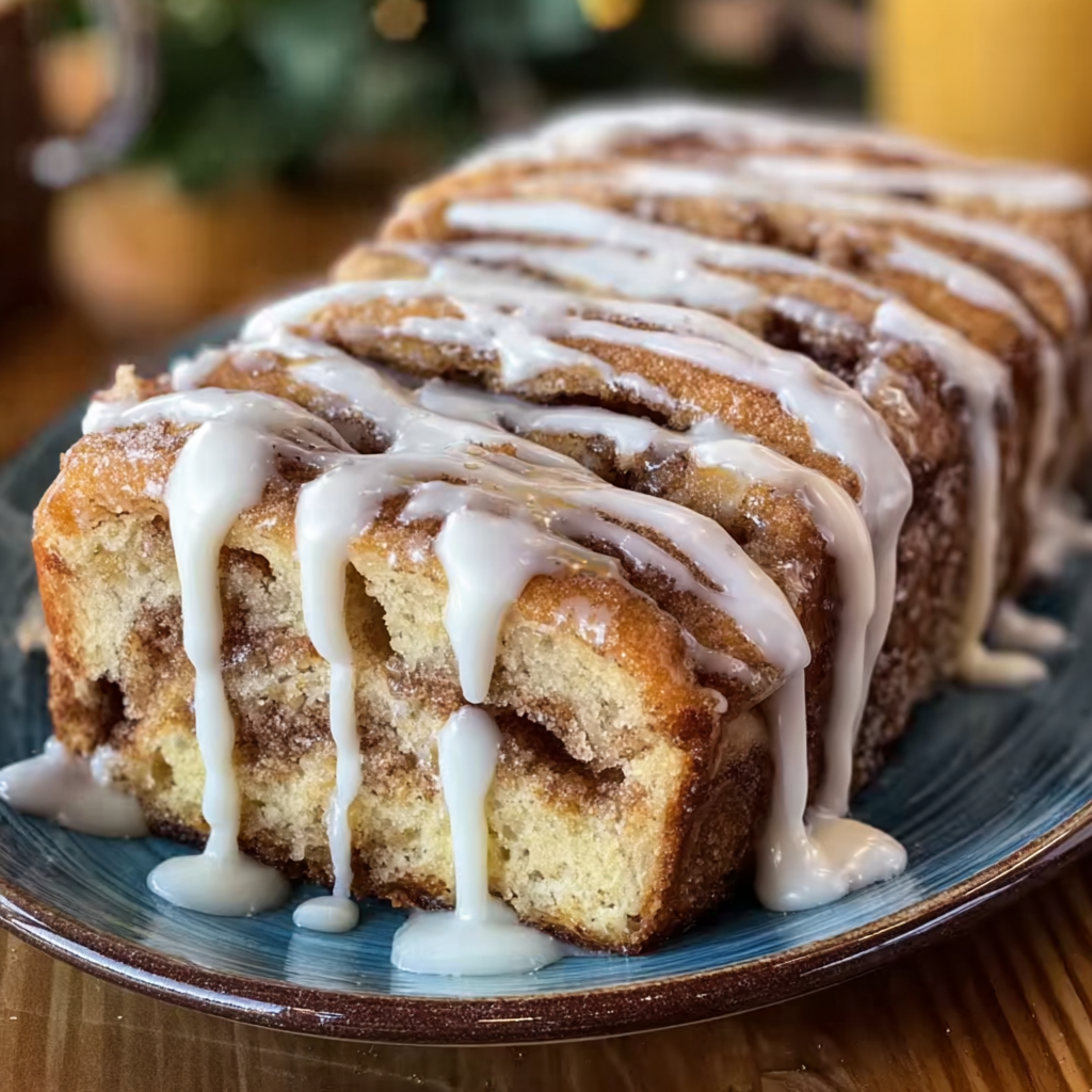 Picture this: A golden loaf that smells like a cinnamon roll and tastes like coffee cake meets snickerdoodle. Every bite has buttery ribbons of cinnamon sugar, soft cake-like bread, and a silky icing drizzle that melts into the warm top.