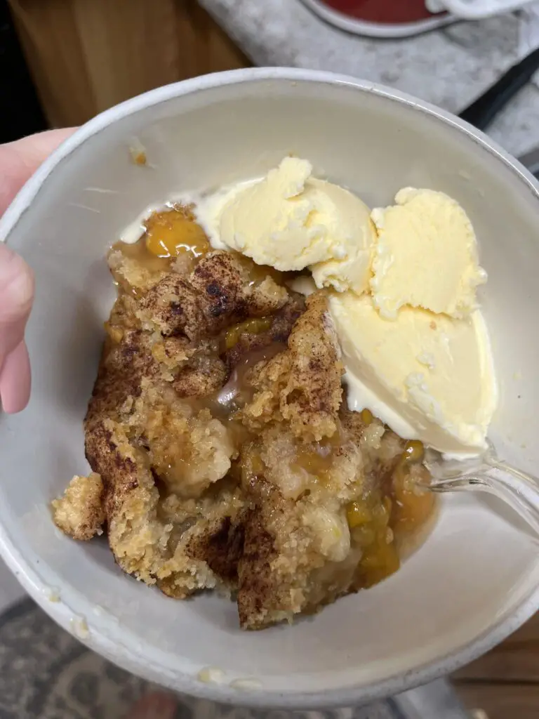 Warm, sweet peaches bubbling beneath a golden, buttery cake topping — almost like a peach pie and shortcake had a baby. The edges get slightly crisp, the inside stays soft and gooey, and every bite feels like summer.