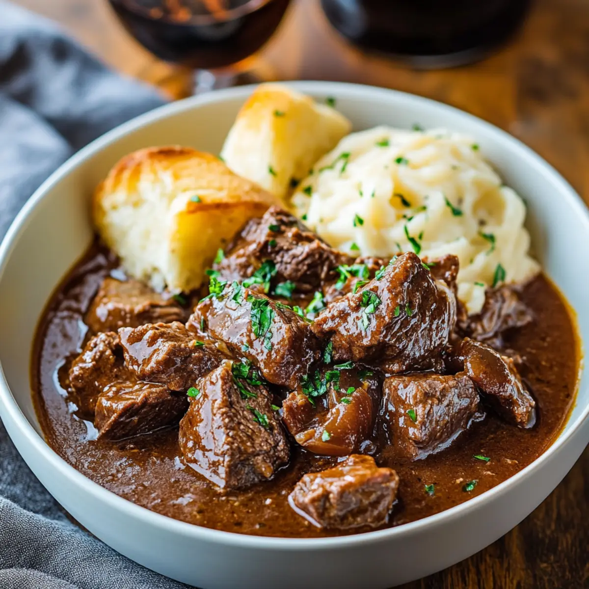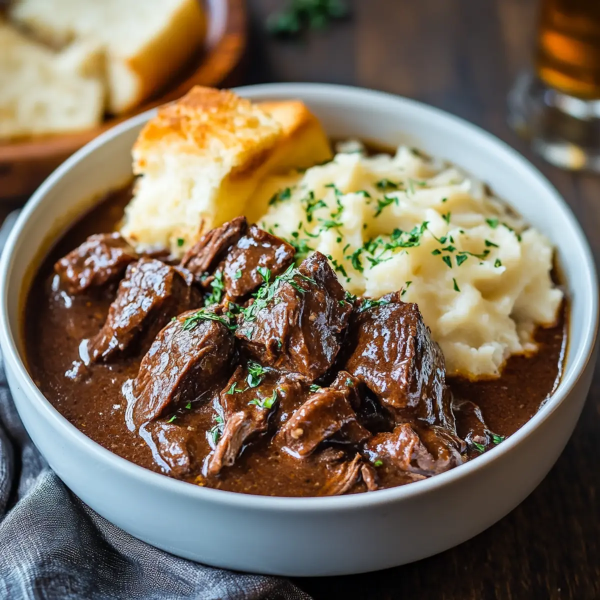 Serving: Once cooked, serve the savory beef and gravy over a generous portion of fluffy mashed potatoes. Don’t forget to add warm garlic bread on the side for the perfect meal experience.
