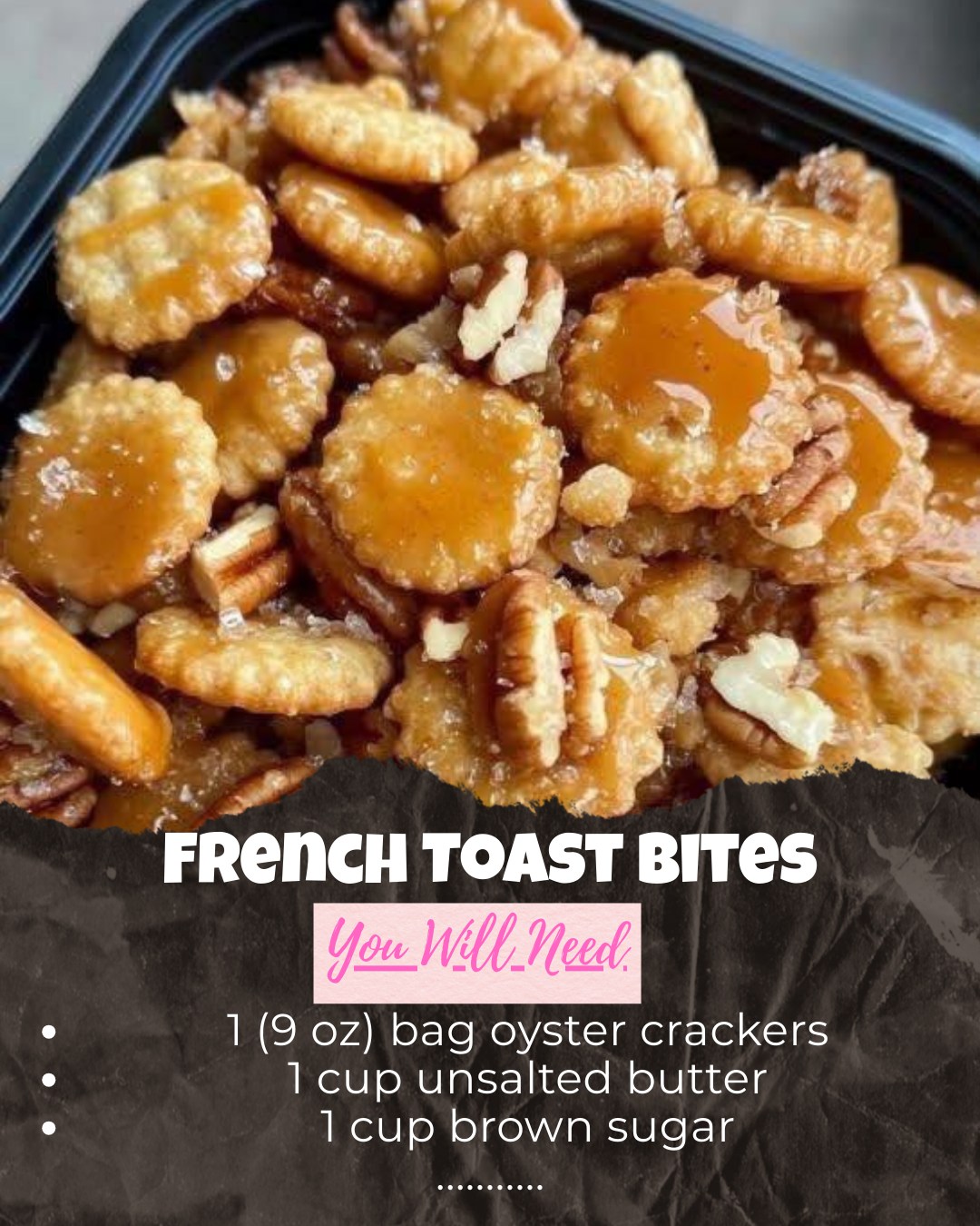 French Toast Bites take everything you love about classic French toast — the buttery richness, the warm cinnamon, the maple sweetness — and transform it into a crunchy, poppable snack you can enjoy anytime. Because this recipe uses oyster crackers instead of bread, the bites absorb a caramel-like glaze that bakes into a crisp, golden coating. Whether you scoop them into a bowl for movie night, pack them into jars as holiday gifts, or scatter them on a brunch board, these irresistibly crunchy French Toast Bites disappear fast.