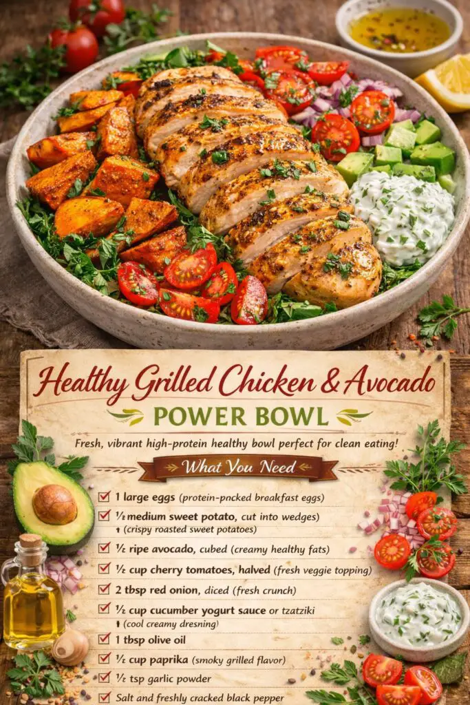 Healthy Grilled Chicken & Avocado Power Bowl offers the perfect balance of flavor, nutrition, and convenience. The combination of grilled chicken, roasted sweet potatoes, fresh vegetables, and creamy tzatziki creates a meal that feels satisfying while supporting healthy eating habits.