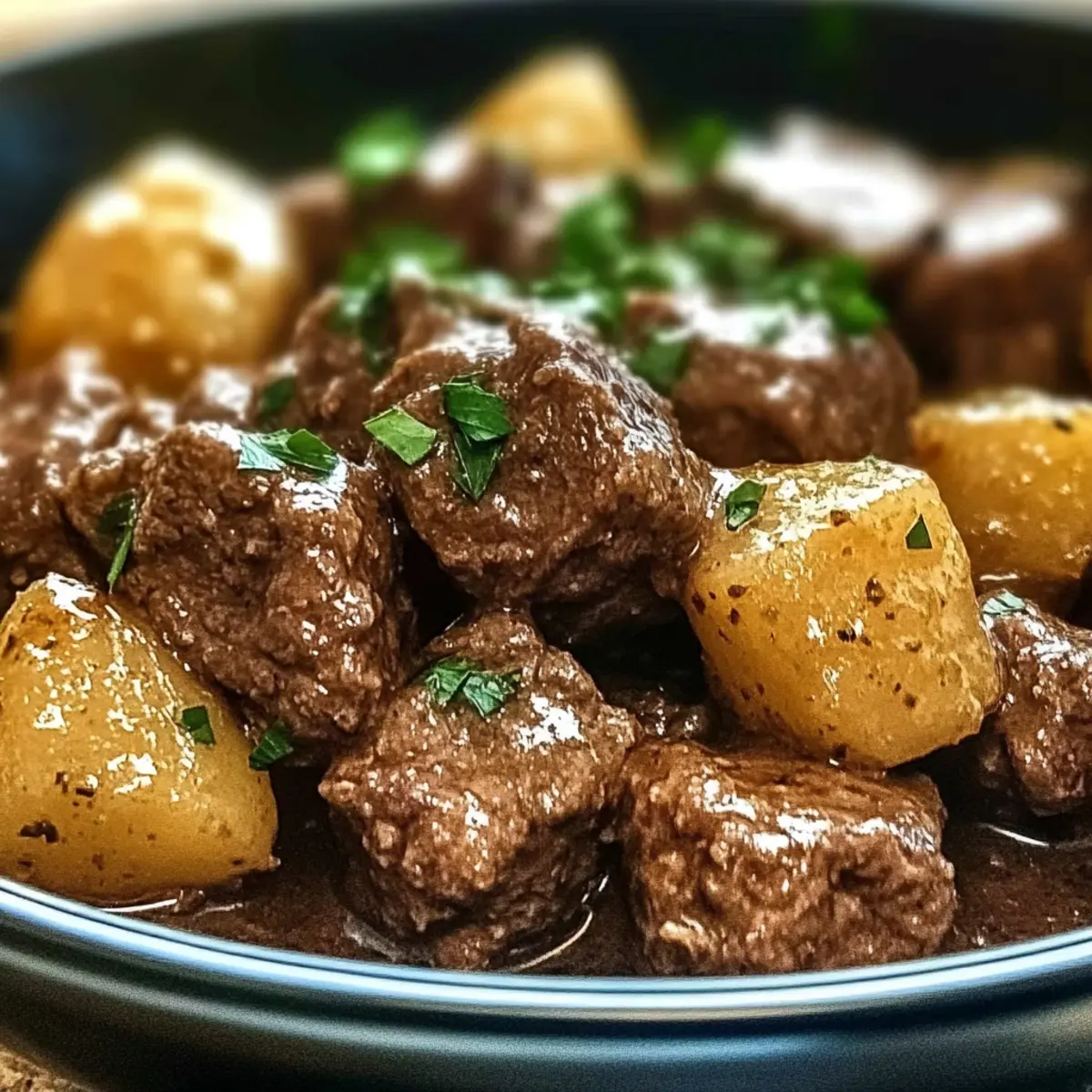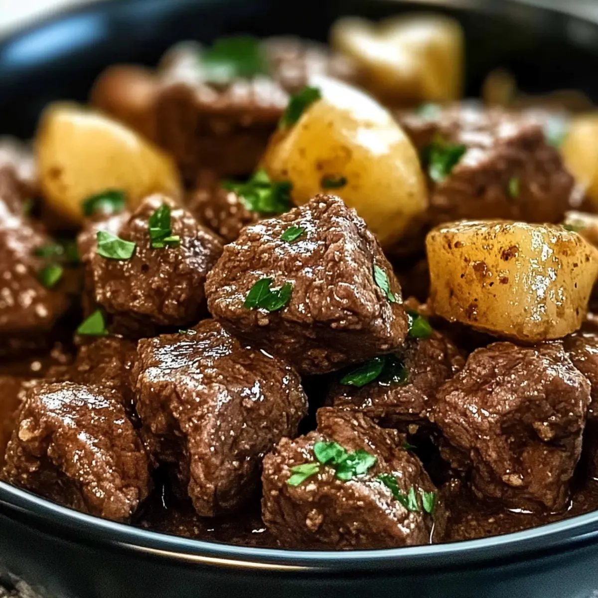 Layer in the slow cooker: Place the halved baby potatoes at the bottom of the slow cooker, followed by the seared beef. Drizzle the garlic butter sauce over the top to infuse the flavors.