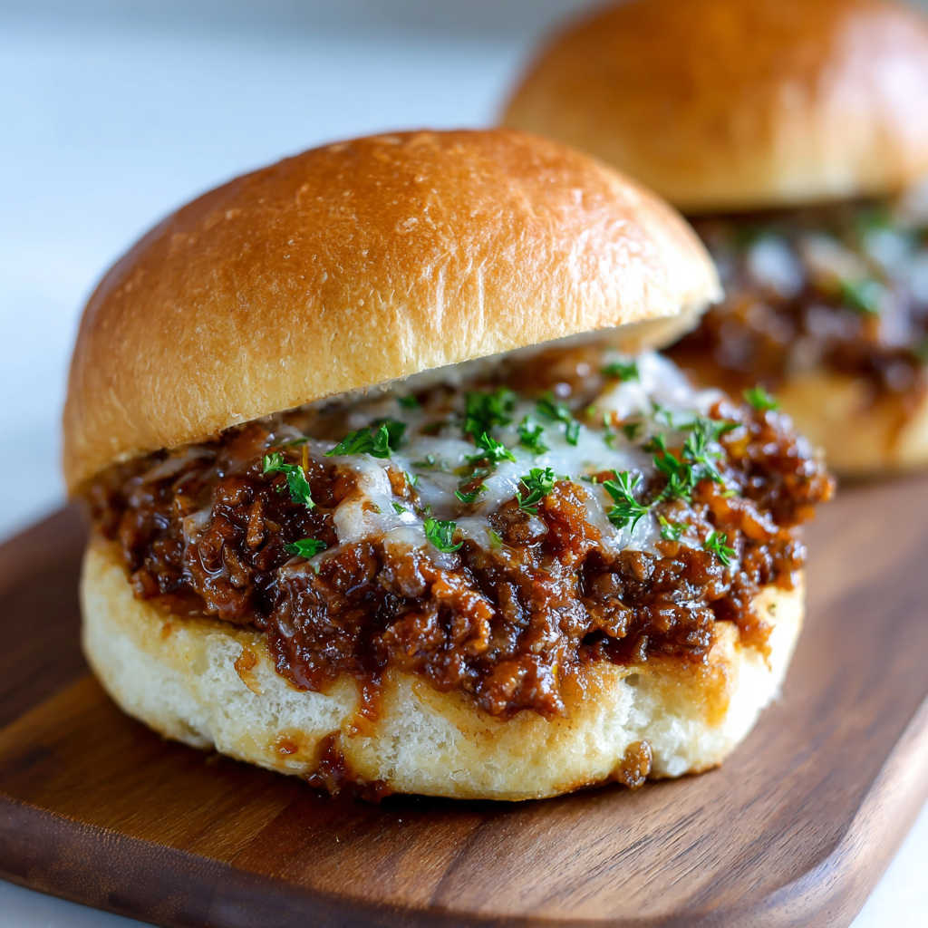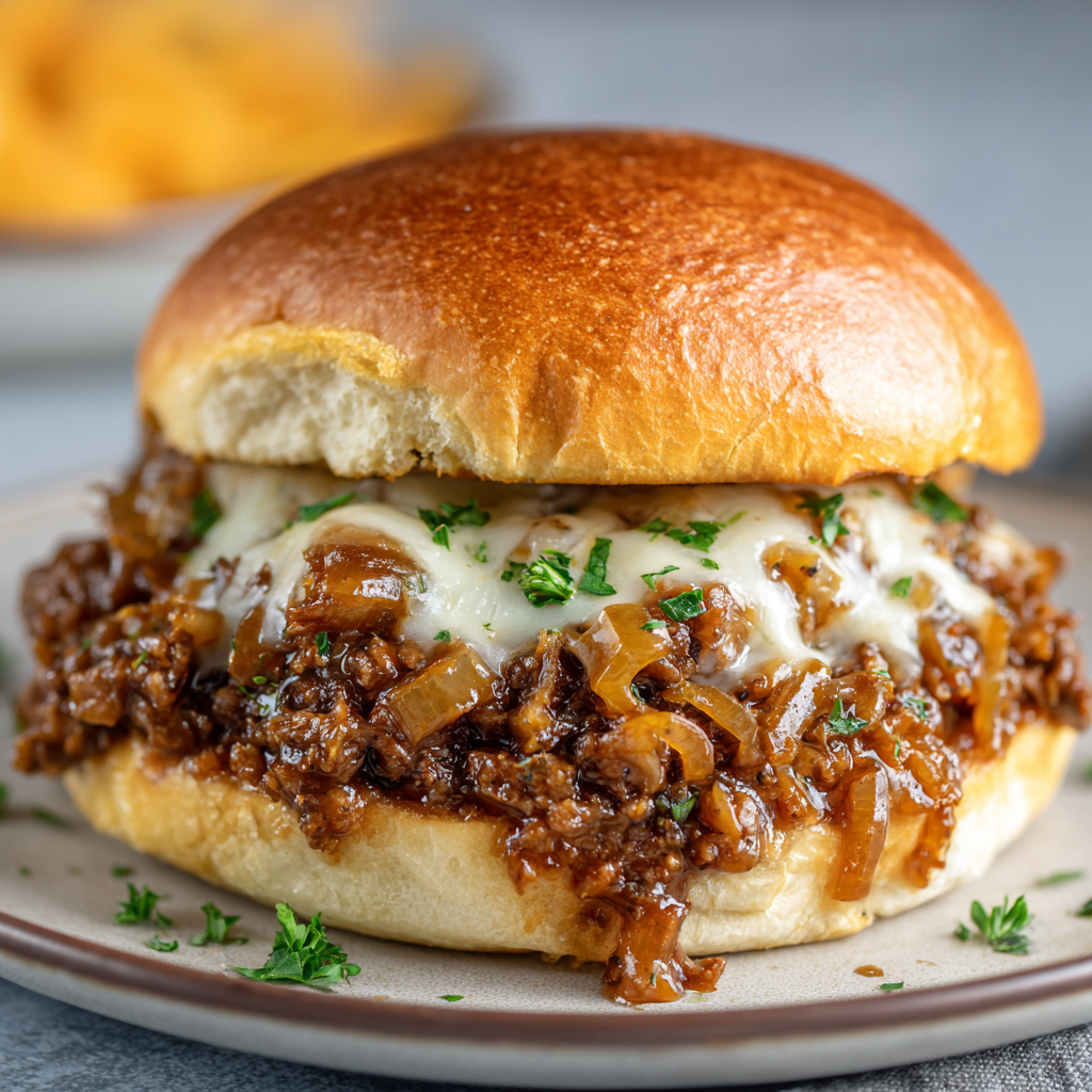 Rich. Savory. Slightly sweet from the slow-cooked onions. The beef is deeply flavorful with hints of garlic, soy, and Worcestershire. Then there’s the Swiss cheese, which adds a buttery nuttiness that ties everything together beautifully. Toasted buns bring just the right crunch, and a sprinkle of fresh parsley brightens the whole bite.