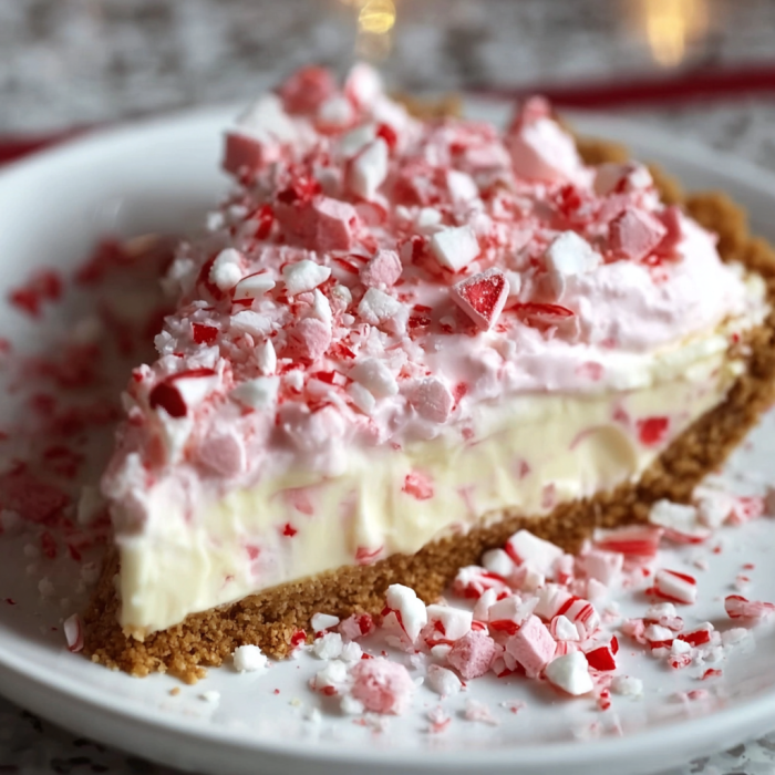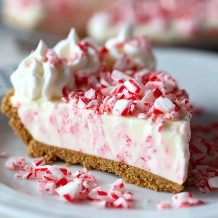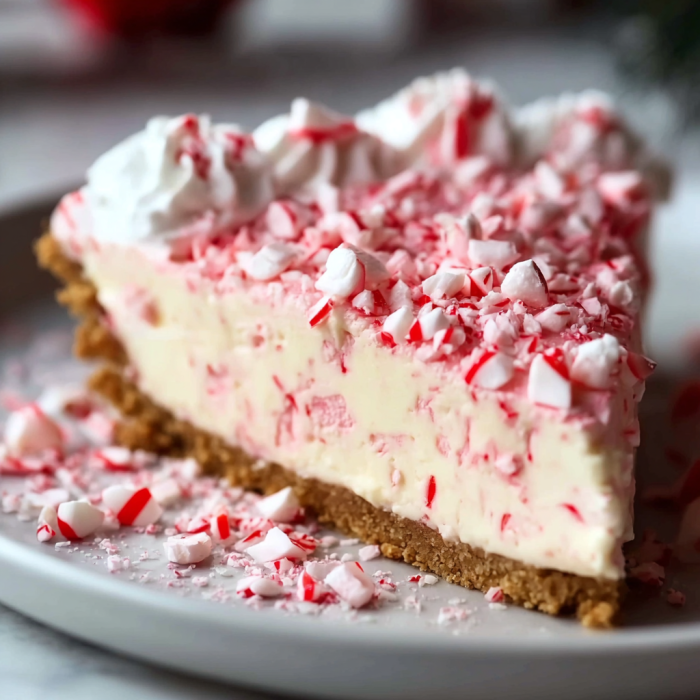 This pie is a holiday dream come true — light and fluffy like a peppermint cloud, with a gentle tang from the cream cheese and a cool minty burst from crushed candy canes. The base is buttery and crumbly, and every bite gives you just the right amount of creamy crunch.