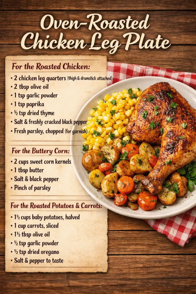 Oven-Roasted Chicken Leg Plate delivers everything you want in a hearty meal: crispy golden skin, juicy chicken, buttery corn, and perfectly roasted vegetables. This dish brings together simple ingredients and transforms them into a deeply satisfying dinner that works for both busy weeknights and relaxed family meals.