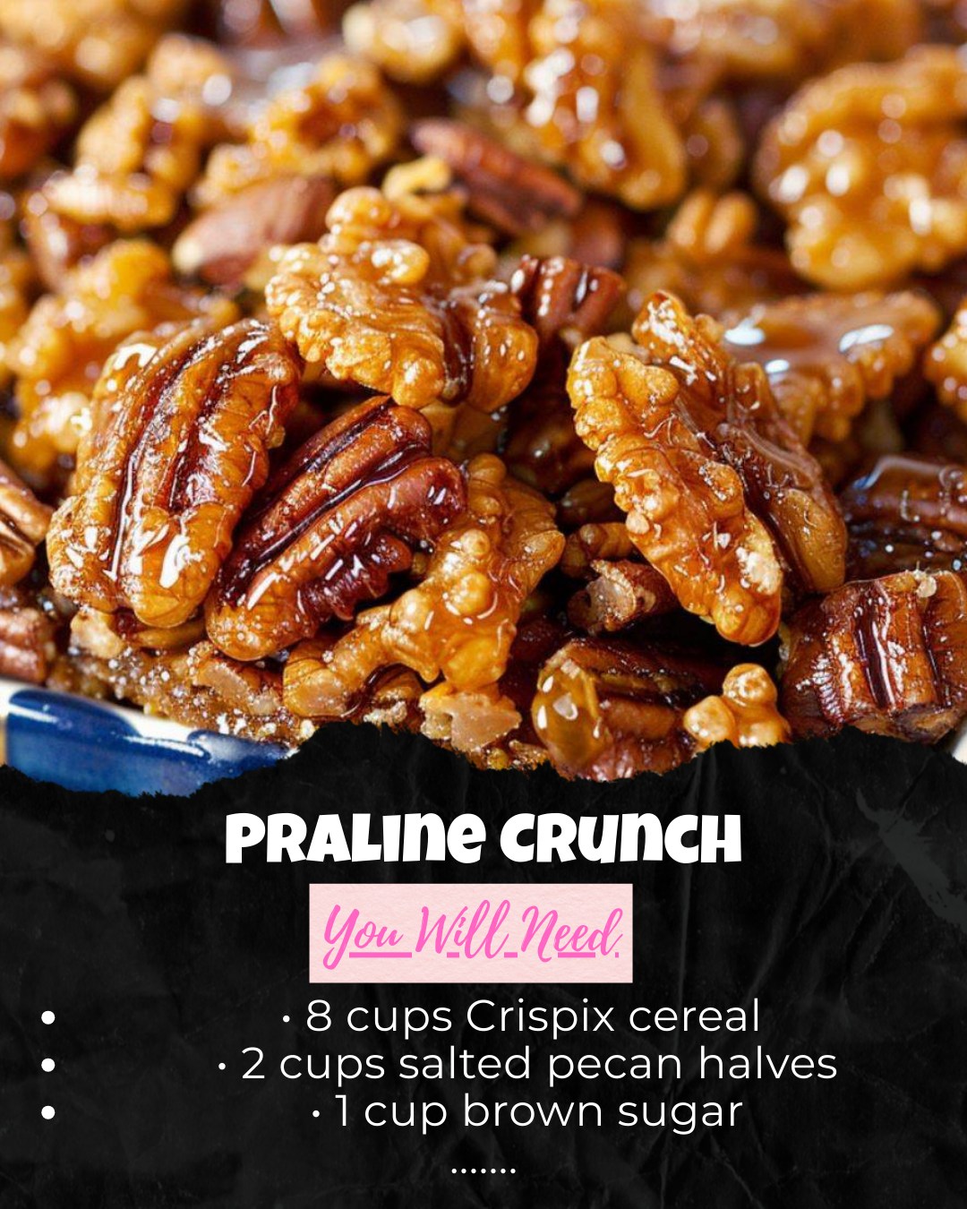 Praline Crunch blends crisp cereal, buttery pecans, and a caramel coating that bakes into a sweet, slightly salty finish. The brown sugar and butter create a deep caramel flavor, while the corn syrup ensures everything sticks together without hardening too much. Vanilla adds warmth, and baking soda gives the mixture its signature light, airy texture.