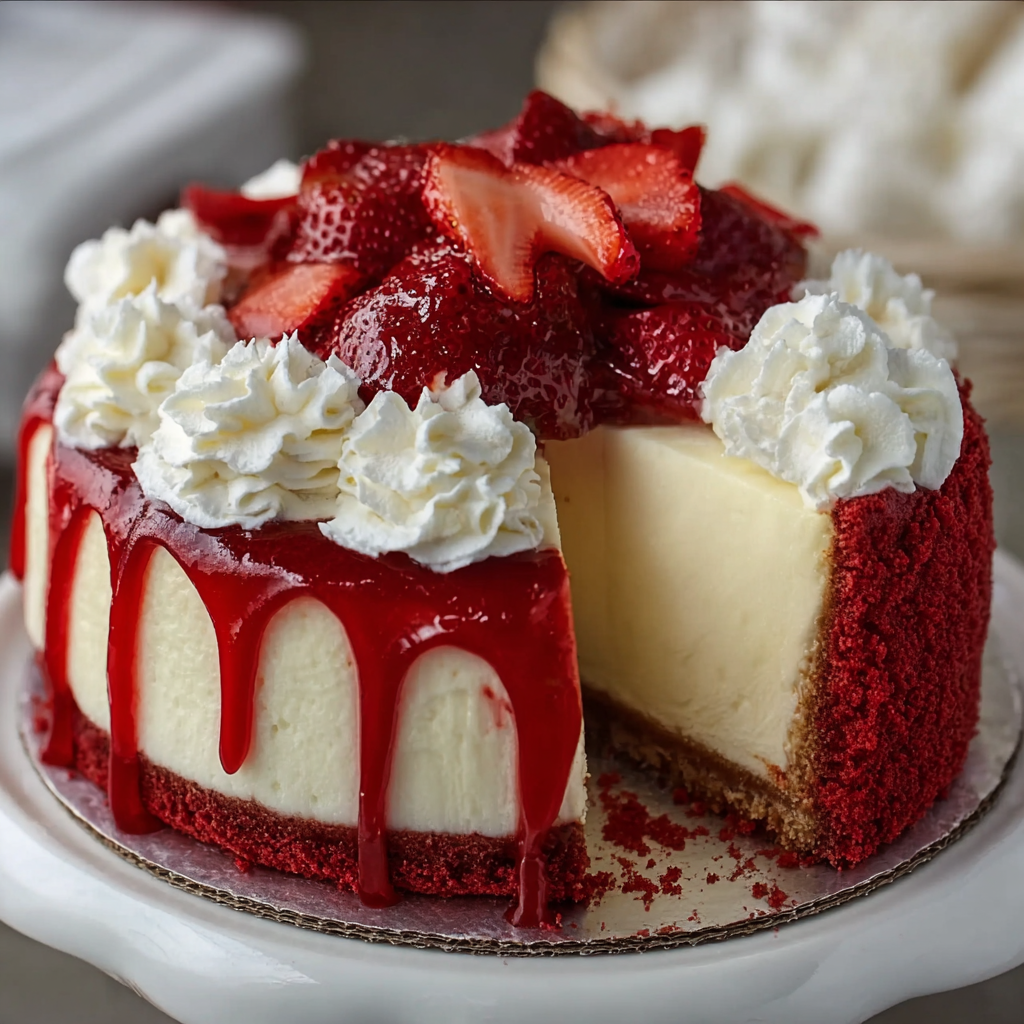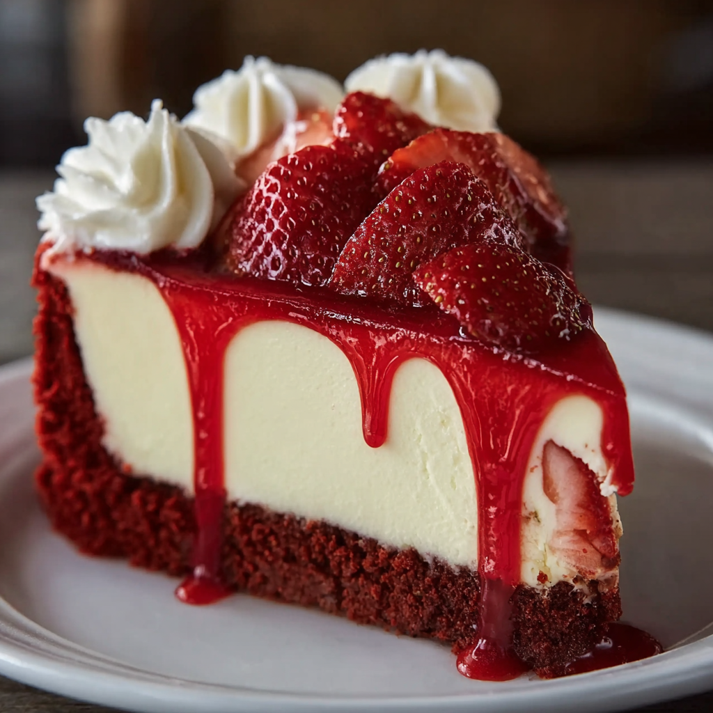 Imagine classic red velvet’s gentle cocoa flavor paired with sweet, fresh strawberry essence — then wrapped into the creamiest cheesecake filling imaginable. The crust adds buttery richness, the filling melts on your tongue, and the topping brings bright, juicy freshness.
