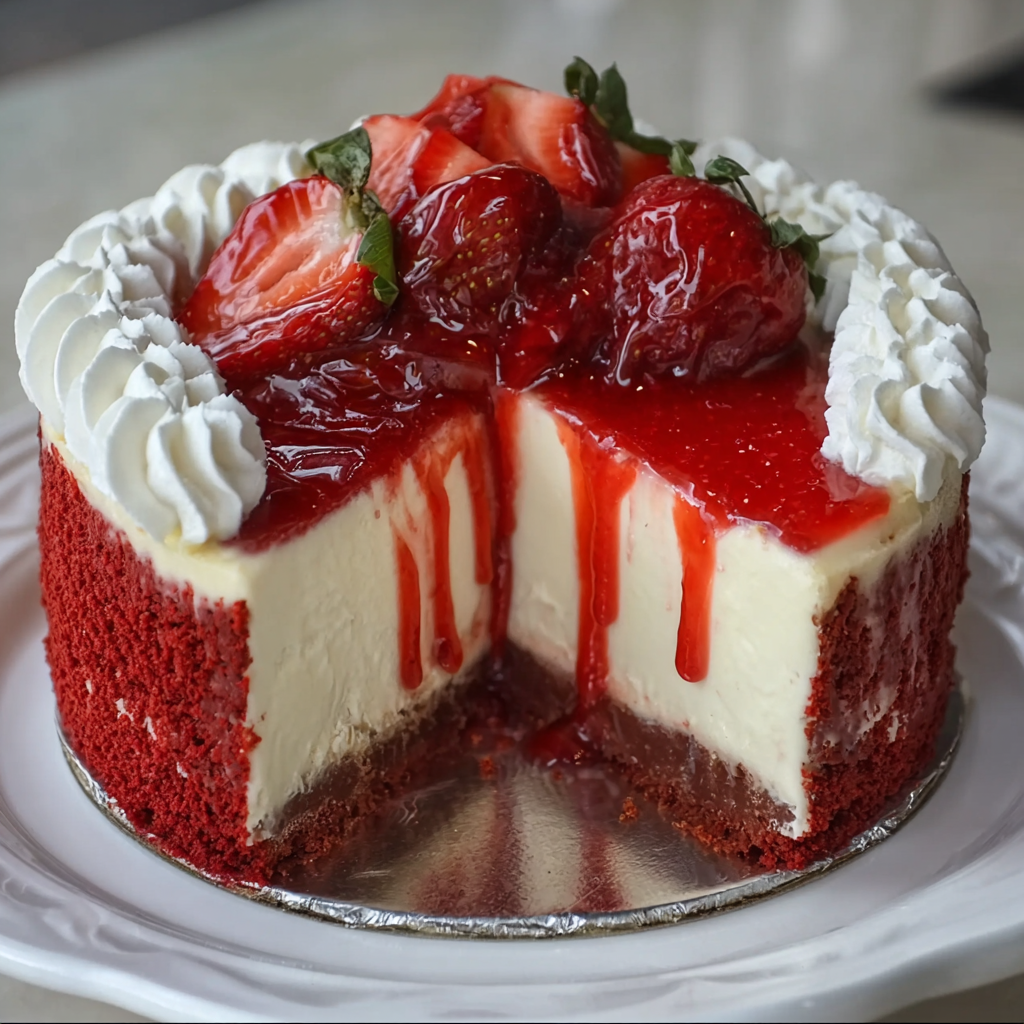 There are desserts… and then there is Red Velvet Strawberry Cheesecake — the kind that makes people stop mid-conversation, inhale deeply, and grin like they’ve been waiting their whole life for this slice. I’m so glad you’re here, because this cheesecake is rich, silky, berry-kissed, and topped with the prettiest glossy strawberry topping. It’s bold, dramatic, tender, comforting — everything a celebration dessert should be!