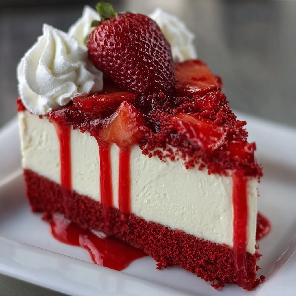 Imagine classic red velvet’s gentle cocoa flavor paired with sweet, fresh strawberry essence — then wrapped into the creamiest cheesecake filling imaginable. The crust adds buttery richness, the filling melts on your tongue, and the topping brings bright, juicy freshness.