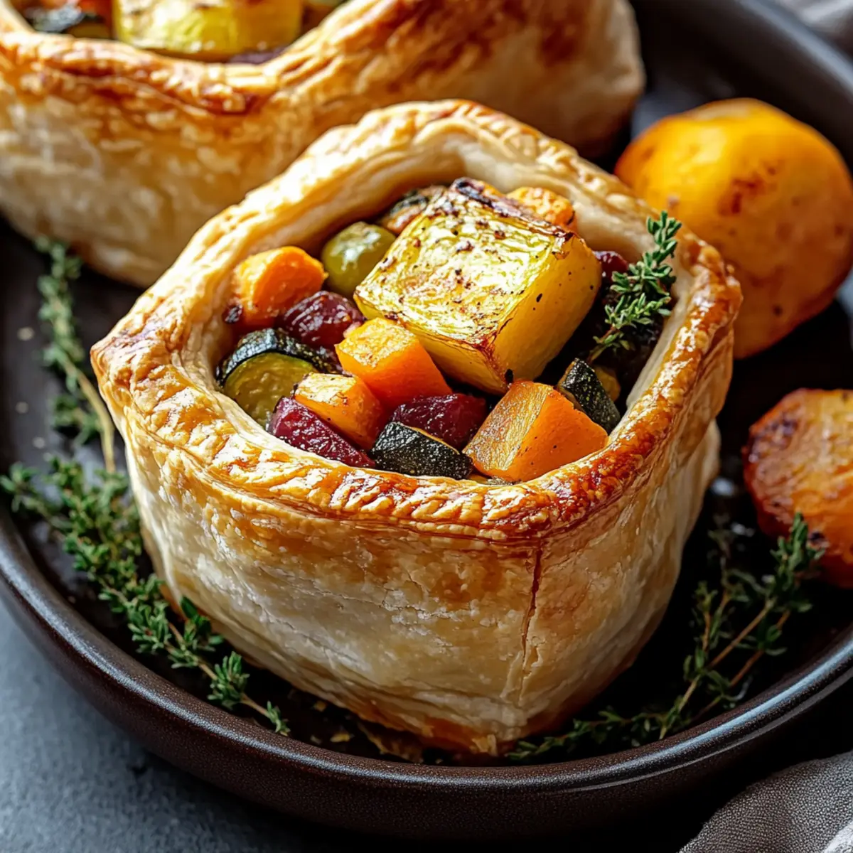 - Divide the vegetable mixture into bowls, then top with puff pastry, sealing the edges.