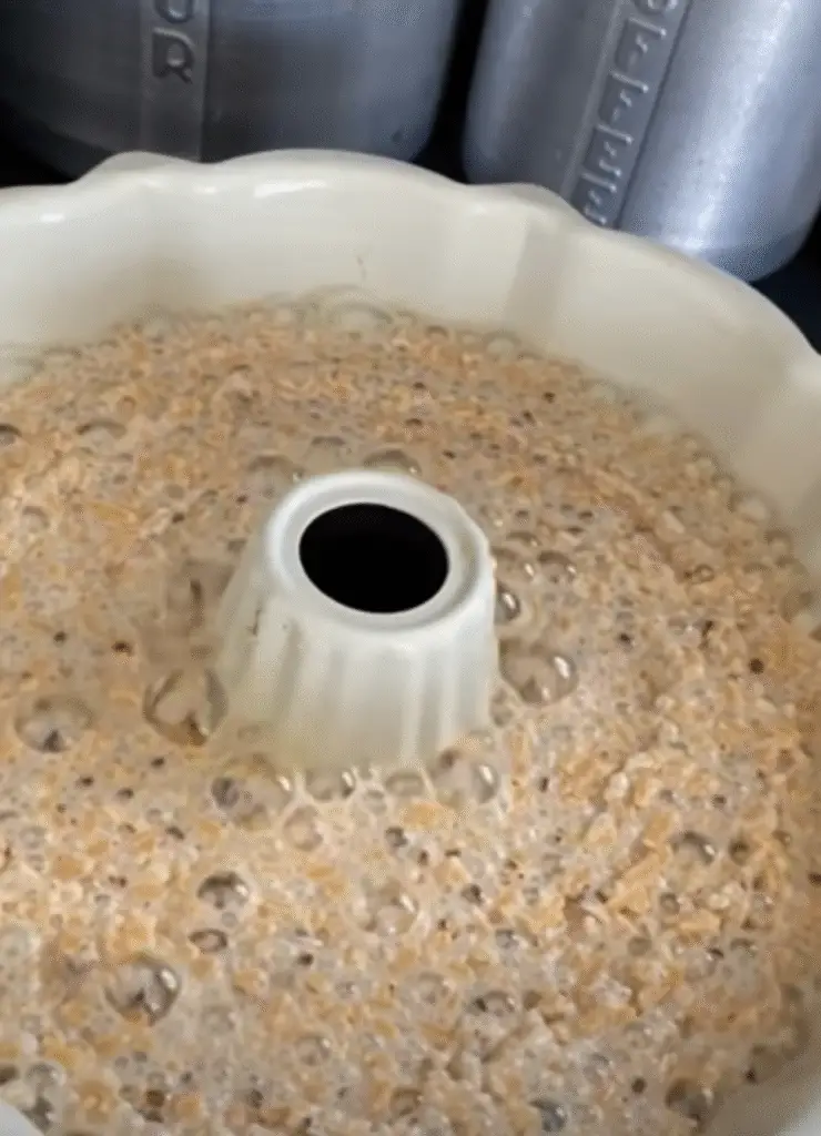 Transfer the mixture into a lightly greased five-cup ring mold. Use a rubber spatula to press it evenly into the mold, eliminating air pockets.