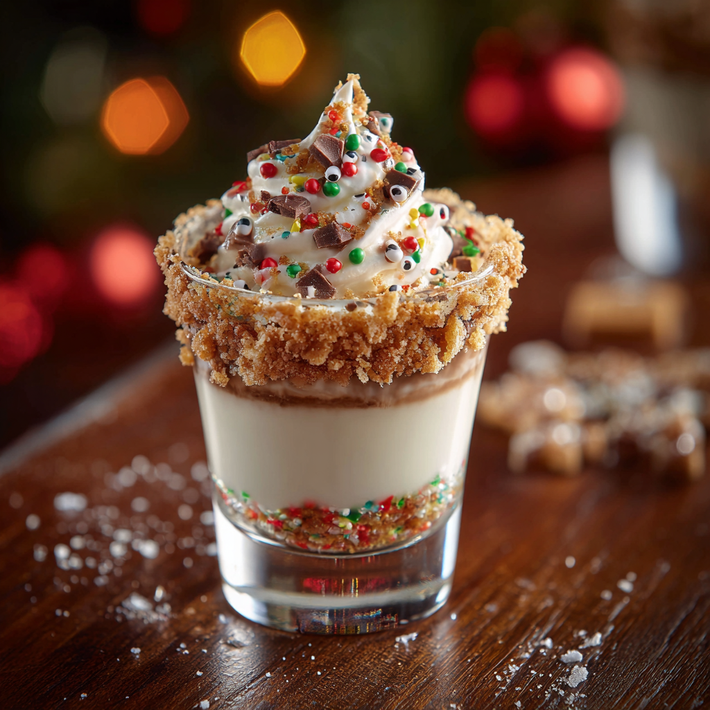 It’s a creamy, cookie-rimmed holiday shot made with vanilla or caramel vodka, a splash of white chocolate or Irish cream liqueur, and smooth cream. It’s festive, sweet, lightly boozy, and tastes like a Christmas dessert in miniature form!
