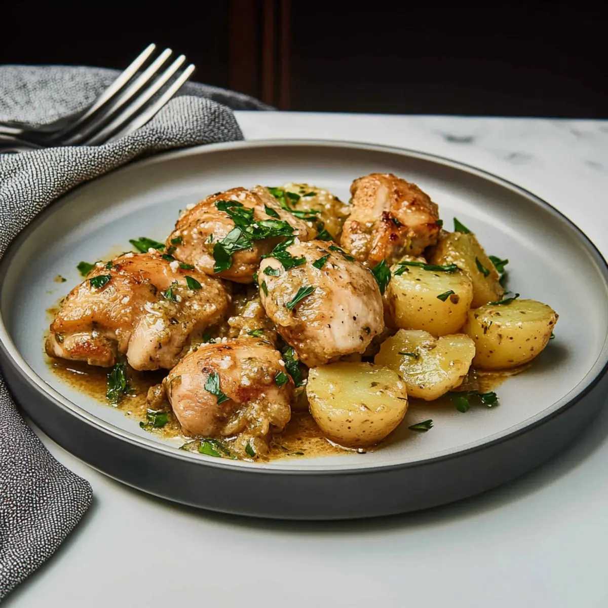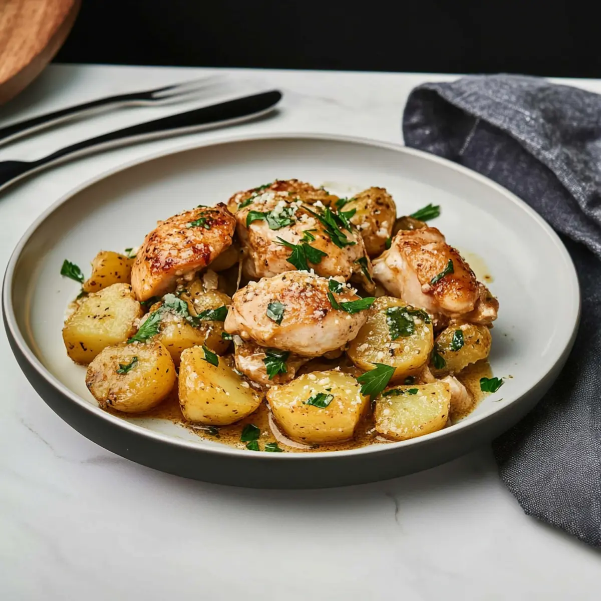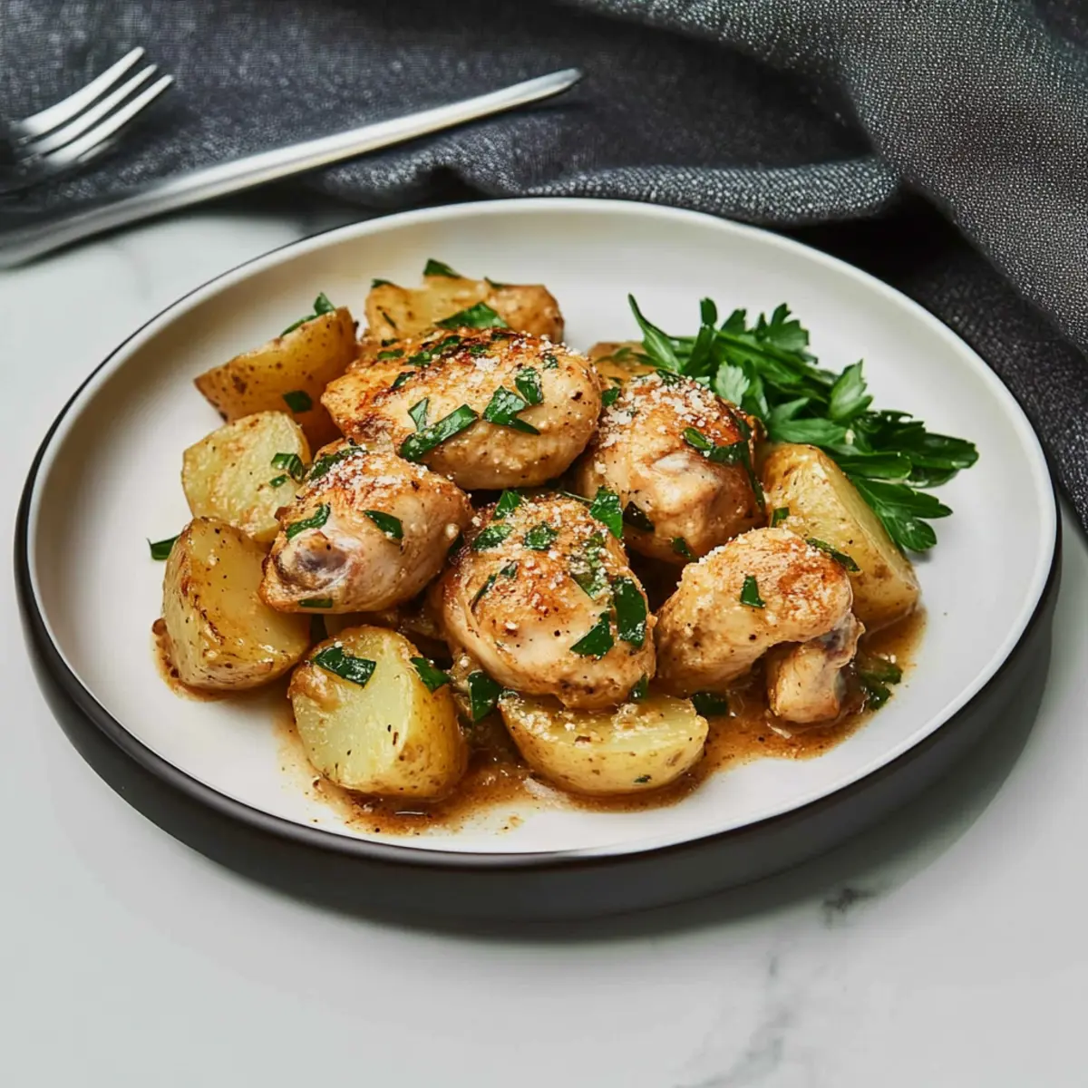 Creamy Indulgence: The rich garlic Parmesan sauce covers tender chicken and potatoes, turning every bite into a comforting delight.