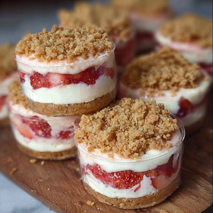 Each bite combines a buttery graham cracker crust, a smooth cheesecake filling, a sweet strawberry layer, and a crunchy topping inspired by those nostalgic strawberry shortcake ice cream bars. And if you choose to turn them into “sandwich bites,” well—let’s just say you’ll never go back to plain cheesecake again!