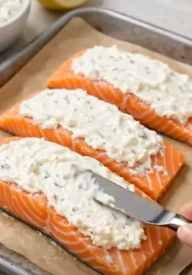 Spread the creamy Parmesan topping evenly over each salmon fillet.